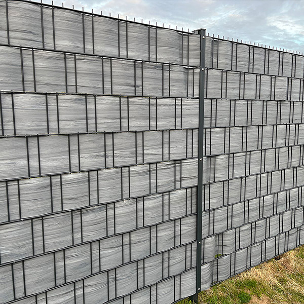 Doppelstabmattenzaun mit Polypropylen Sichtschutz und Abstufung von 183cm auf 163cm.
